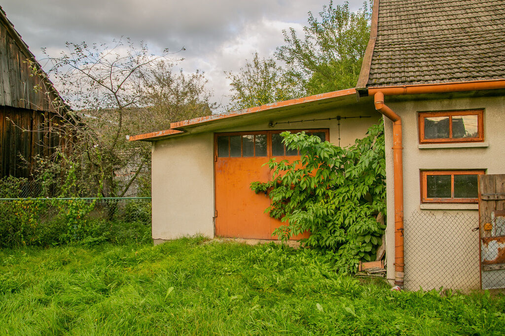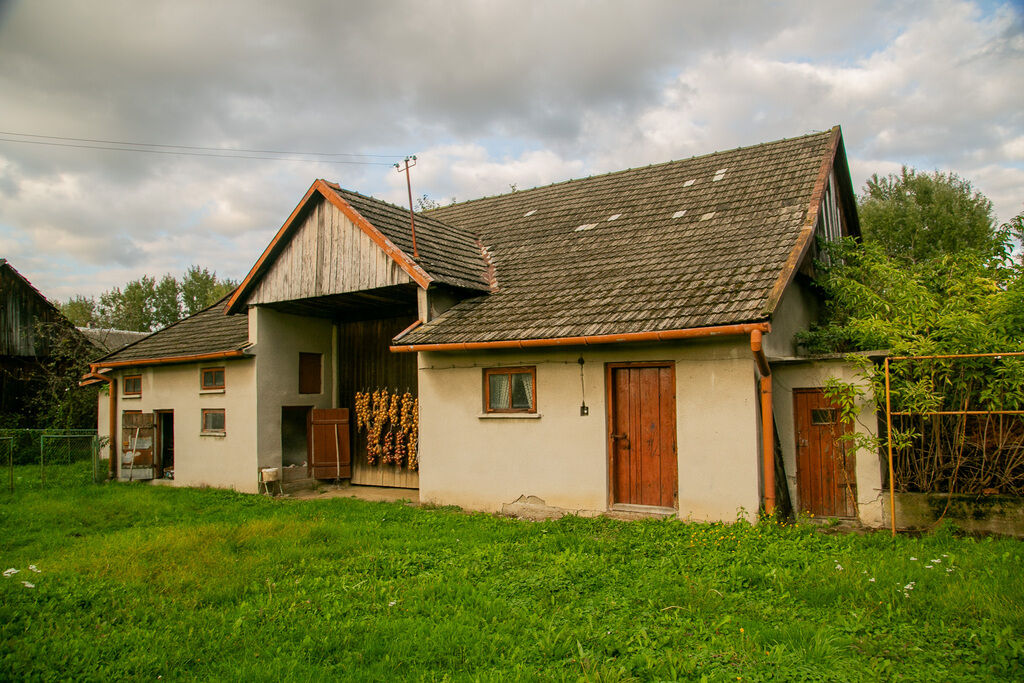 Nieruchomość obejmuje dom mieszkalny, duży budynek gospodarczy oraz